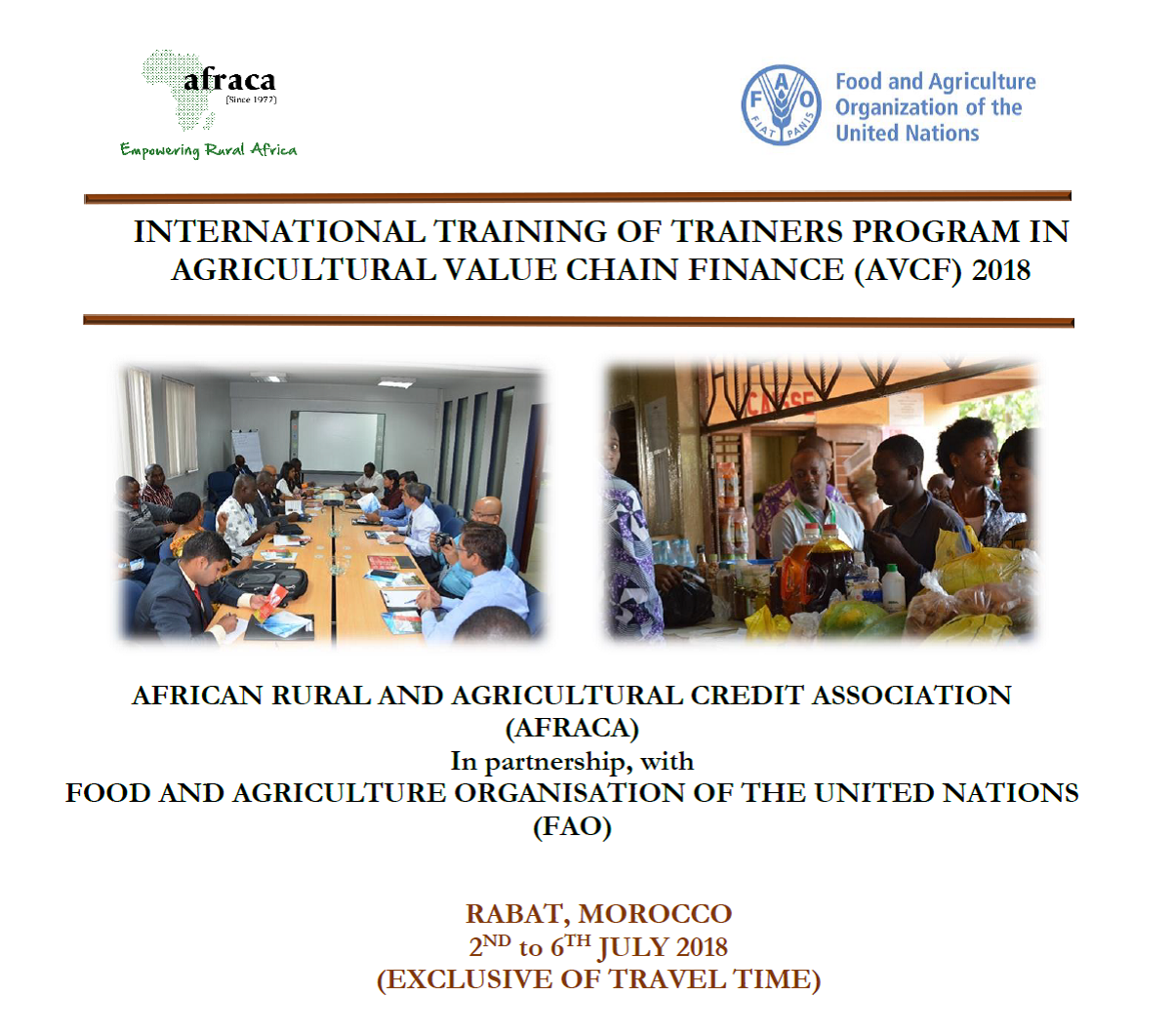 Read more : Apraca Invitation ToT Morocco English Read more : Logistic Note 2 Read more : NOMINATION FORM REGISTER FOR OUR UPCOMING EVENTS!!! Event Date Location 1. Afraca Risk-Sharing Policy Conference alongside twin trainings; The International Training of Trainers programme in Agricultural Value Chain Finance (AVCF) for Anglophone and