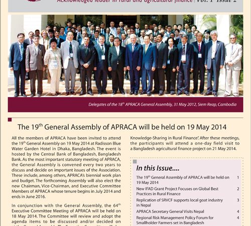 In this Issue… The 19th General Assembly of APRACA will be held on 19 May 2014 New IFAD Grant Project Focuses on Global Best Practices in Rural Finance Replication of SRVCF supports local goat industry in Nepal APRACA Secretary General Visits Nepal Regional Risk Management Policy Forum for Smallholder Farmers set in Bangladesh APRACA-AVRDC-WVC to