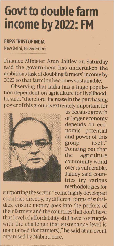 Publication : Business Standard Headline : Govt to double farm income by 2022: FM Date : 18/12/2017 Page No : 06