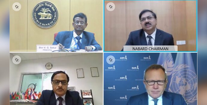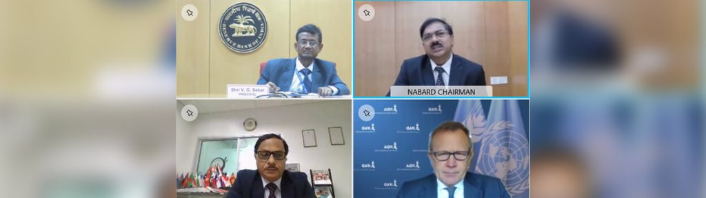 Inaugural Session of international symposium addressed by Dr. G R Chintala, Chairman NABARD and APRACA Chairman alongside Mr. V G Sekar, Principal of CAB, Mr. Nigel Brett, Director of IFAD and Dr. Prasun Kumar Das, Secretary General of APRACA