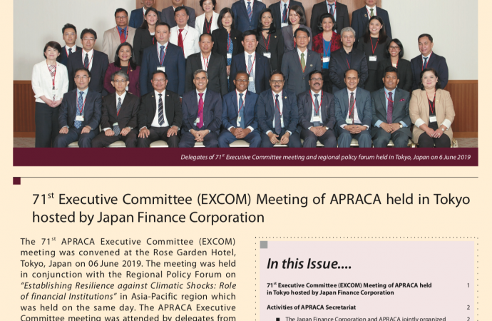 71st Executive Committee (EXCOM) Meeting of APRACA held in Tokyo hosted by Japan Finance Corporation Activities of APRACA Secretariat The Japan Finance Corporation and APRACA jointly organized Regional Policy forum on ‘Establishing Resilience against Climatic Shocks: Role of financial Institutions’ on 6 June 2019 APRACA organized the Learning and Exposure visits programme on Agricultural Value