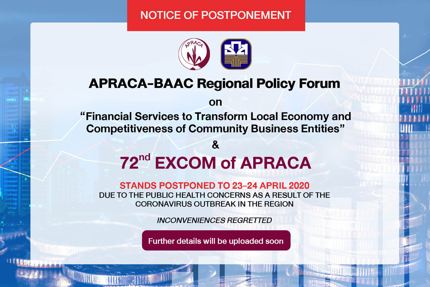 APRACA-BAAC Regional Policy Forum on “Financial Services to Transform Local Economy and Competitiveness of Community Business Entities” & 72nd EXCOM of APRACA