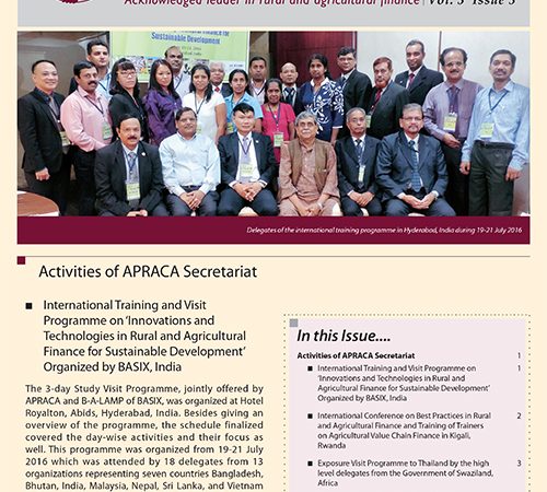 Activities of APRACA Secretariat  – International Training and Visit Programme on  ‘Innovations and Technologies in Rural and Agricultural Finance for Sustainable Development’ Organized by BASIX, India  – International Conference on Best Practices in Rural and Agricultural Finance and Training of Trainers on Agricultural Value Chain Finance in Kigali, Rwanda  – Exposure Visit Programme to Thailand