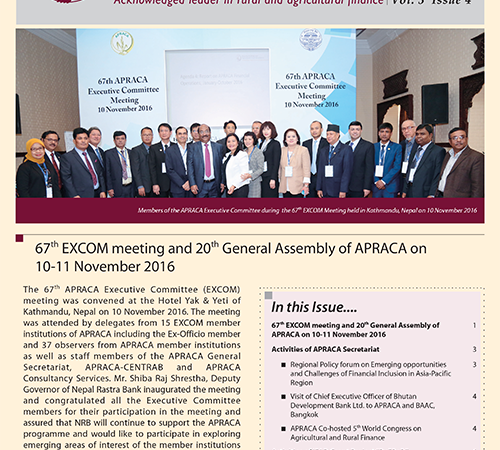 67th EXCOM meeting and 20th General Assembly of APRACA on 10-11 November 2016 Activities of APRACA Secretariat – Regional Policy forum on Emerging opportunities and Challenges of Financial Inclusion in Asia-Pacific Region – Visit of Chief Executive Officer of Bhutan Development Bank Ltd. to APRACA and BAAC, Bangkok – ACLEDA Bank Plc, CREDIT, and