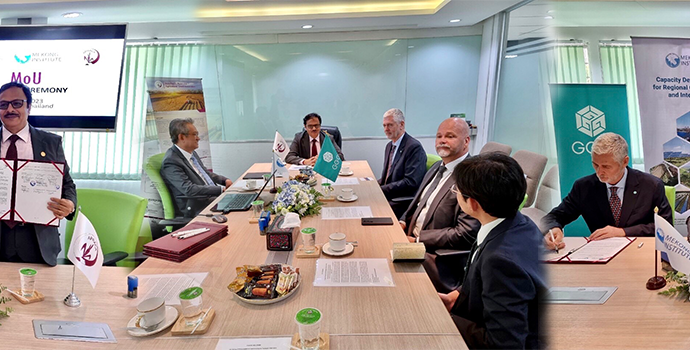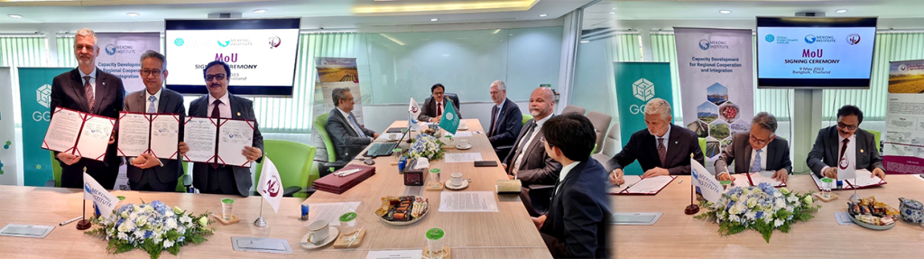 Dr. Prasun Kuma Das, Secretary General of APRACA, Mr. Frank Rijsberman, Director of GGGI and Mr. Suriyan Vichitlekarn, Executive Director of MI joined the signing of Institutional Memorandum of Understanding and partnership agreement at the APRACA Secretariat on 9 May 2023