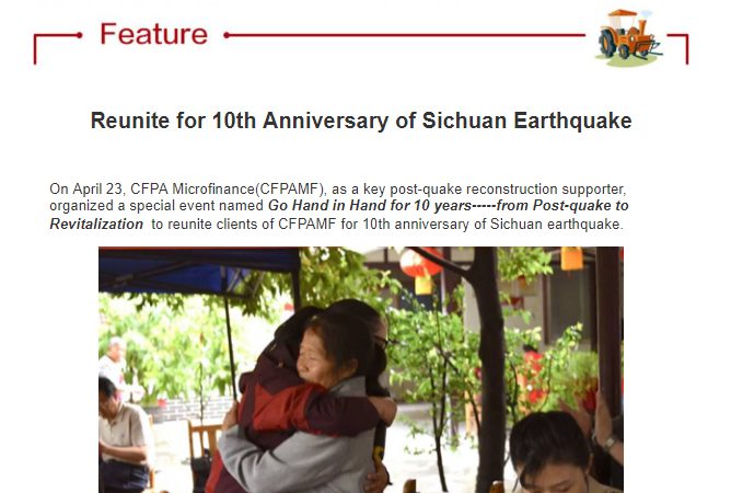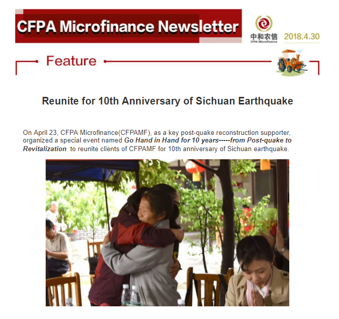 On May 12, 2008, the magnitude 8 quake hit Wenchuan, Sichuan province, killing nearly 70,000 people and leaving nearly 18,000 people missing and millions more homeless. CFPAMF, at the first time, set up a branch in Mianzhu to finance local residents to rebuild their lives. With the business growth, so far, CFPAMF services have covered 10 cities and counties in Sichuan and benefited over 45,480 households involving total loans of RMB1.8 billion.