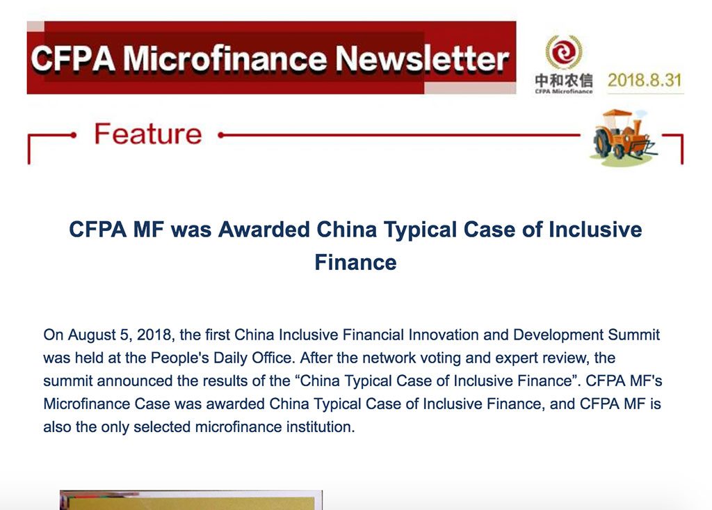 CFPA MF was Awarded China Typical Case of Inclusive Finance On August 5, 2018, the first China Inclusive Financial Innovation and Development Summit was held at the People's Daily Office. After the network voting and expert review, the summit announced the results of the “China Typical Case of Inclusive Finance”. CFPA MF's Microfinance Case was