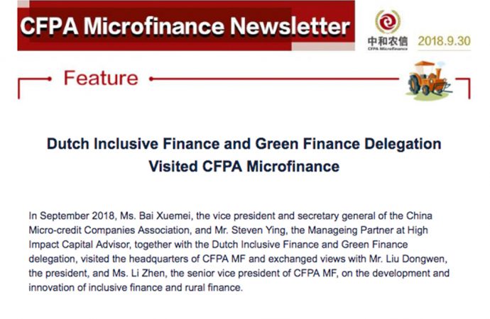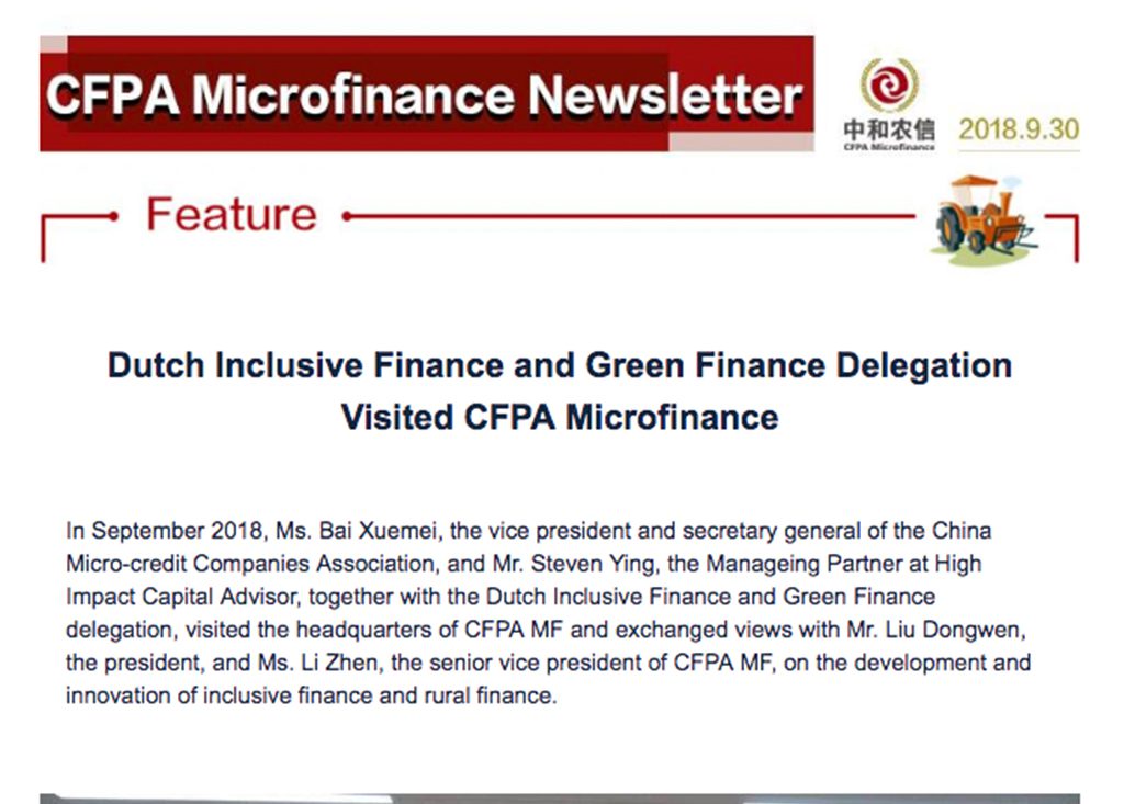 Dutch Inclusive Finance and Green Finance Delegation Visited CFPA Microfinance In September 2018, Ms. Bai Xuemei, the vice president and secretary general of the China Micro-credit Companies Association, and Mr. Steven Ying, the Manageing Partner at High Impact Capital Advisor, together with the Dutch Inclusive Finance and Green Finance delegation, visited the headquarters of CFPA