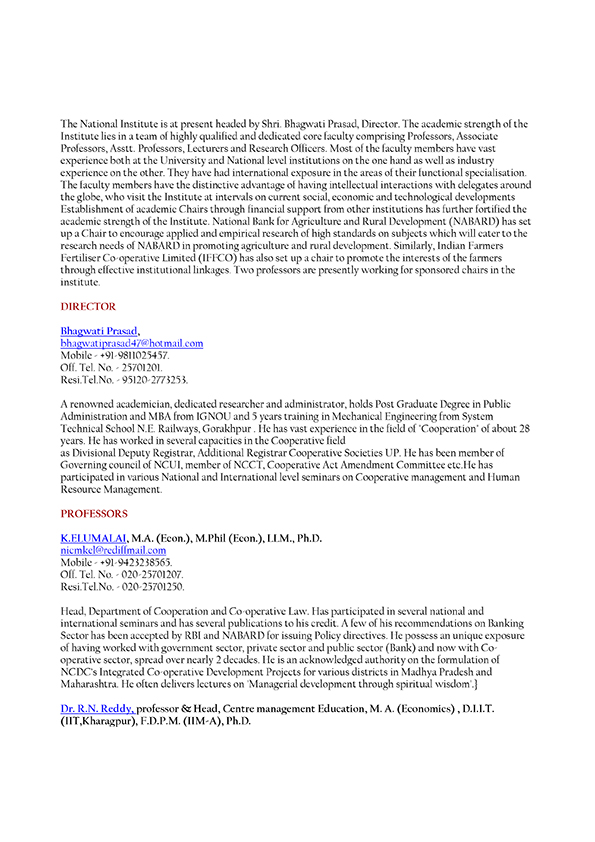 The National Institute is at present headed by Shri. Bhagwati Prasad, Director. The academic strength of the Institute lies in a team of highly qualified and dedicated core faculty comprising Professors, Associate Professors, Asstt. Professors, Lecturers and Research Officers.