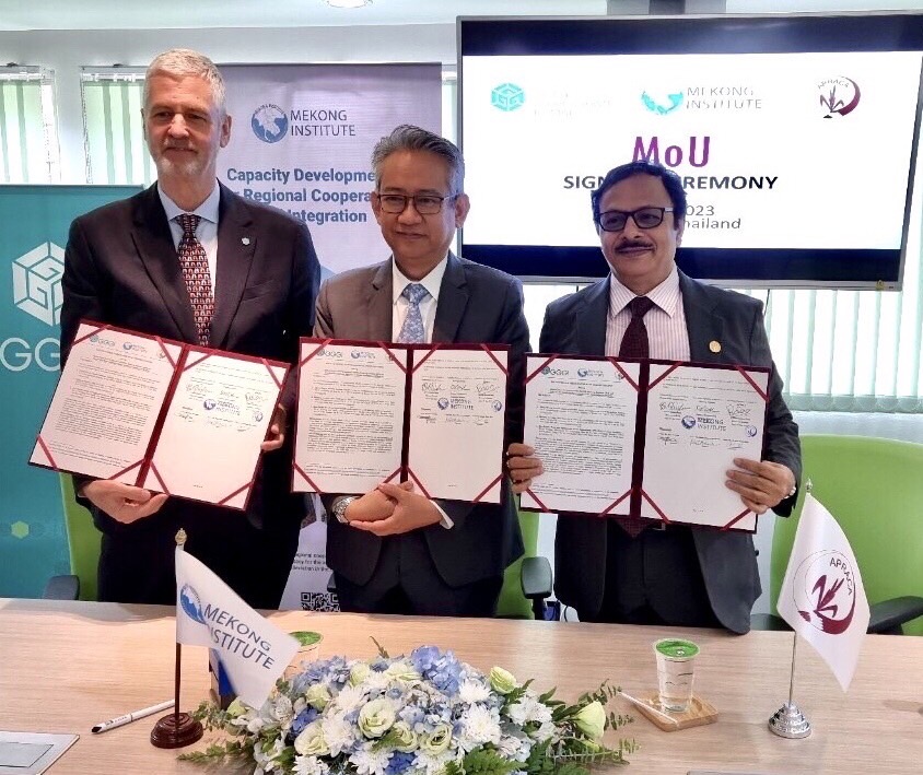 Dr Frank Rijsberman, Director General of Global Green Growth Institute (GGGI), Mr Suriyan Vichitlekarn, Executive Director of Mekong Institute (MI) and Dr Prasun Kumar Das, Secretary General of Asia-Pacific Rural and Agricultural Credit Association (APRACA) signed an Institutional Memorandum of Understanding (MoU) on 9 May 2023 at the APRACA Secretariat, Bangkok, Thailand.