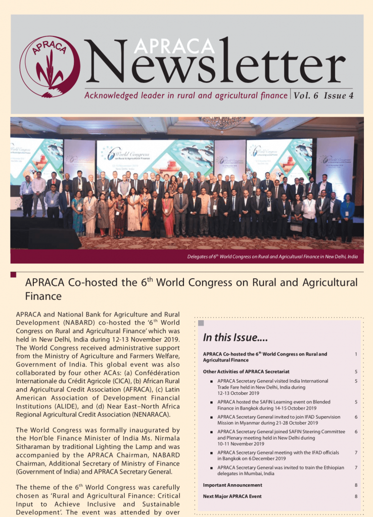APRACA Co-hosted the 6th World Congress on Rural and Agricultural Finance Activities of APRACA Secretariat APRACA Secretary General visited India International Trade Fare held in New Delhi, India during 12-13 October 2019 APRACA hosted the SAFIN Learning event on Blended Finance in Bangkok during 14-15 October 2019 APRACA Secretary General invited to join IFAD Supervision